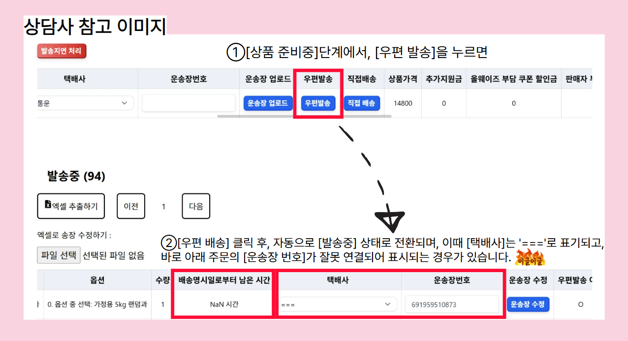 * 이러한 경우, '우편(일반우편, 등기 등)으로 발송되는 상품'은 '실제 운송장 번호'를 셀러님께서 직접 등록해 주셔야 합니다.