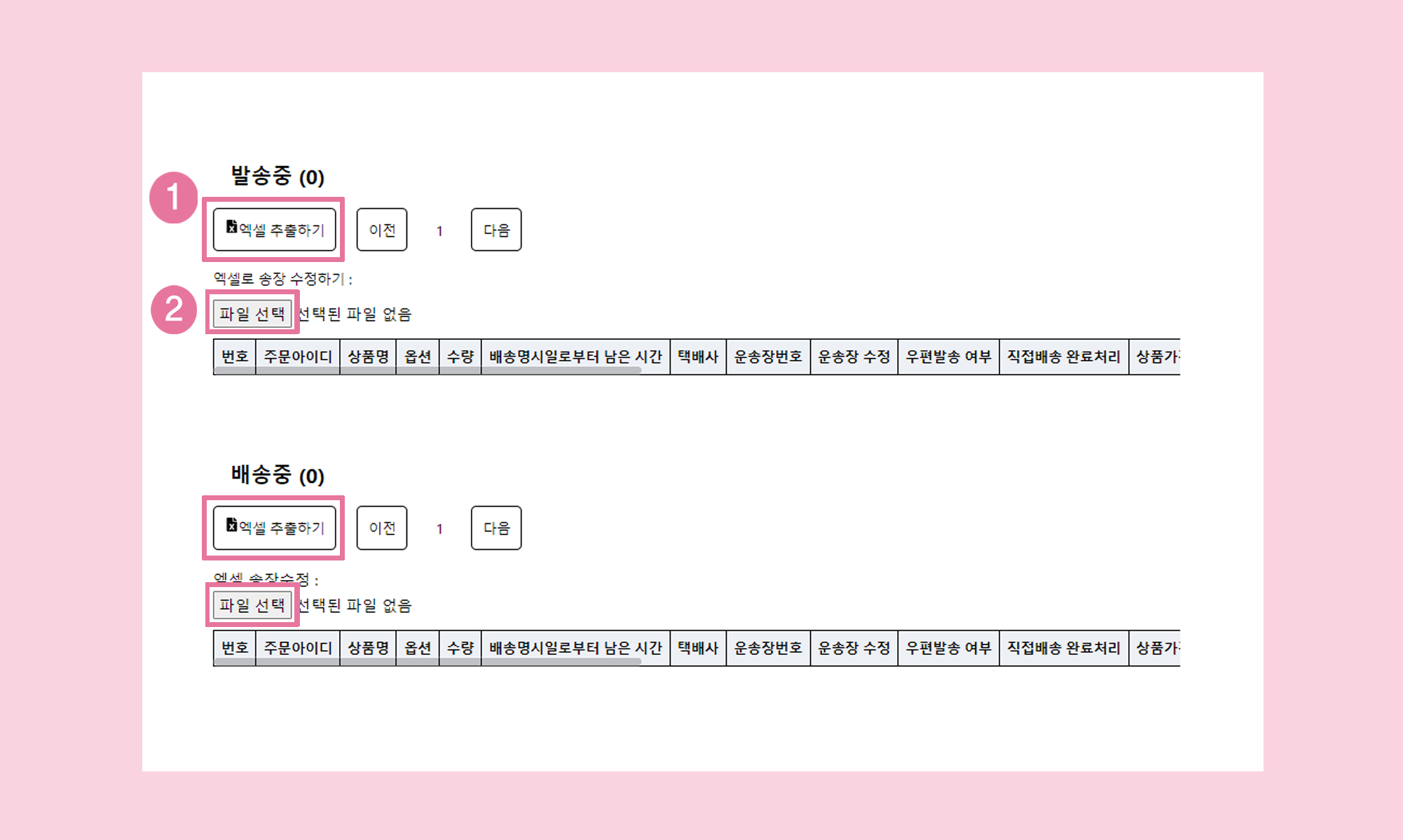 * **Step 3:** \[발송중 or 배송중] 엑셀 추출하기 하단 \[파일 선택]에서 업로드